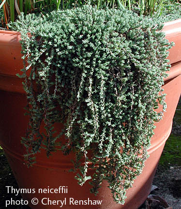 Juniper Thyme | | | | The nomenclature for this thyme seems particularly screwed up (even more so than for all the rest of the thymes, which is hard to believe!). As far as I've been able to determine, the correct name is listed here, but T. neiceffii can also be found as T. neceffii, T. neicefferi, and T. necefferi (and those are just the closely-related names). Regardless of what it's called, this is lovely falling over the edge of a pot, with or without its soft pink flowers. Images: whole plant. |