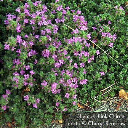 Carpeting thymes spread across the ground and are up to 1 to 2 inches tall. They can be grown between paving stones, next to paths, or in beds with other spreading thymes. |